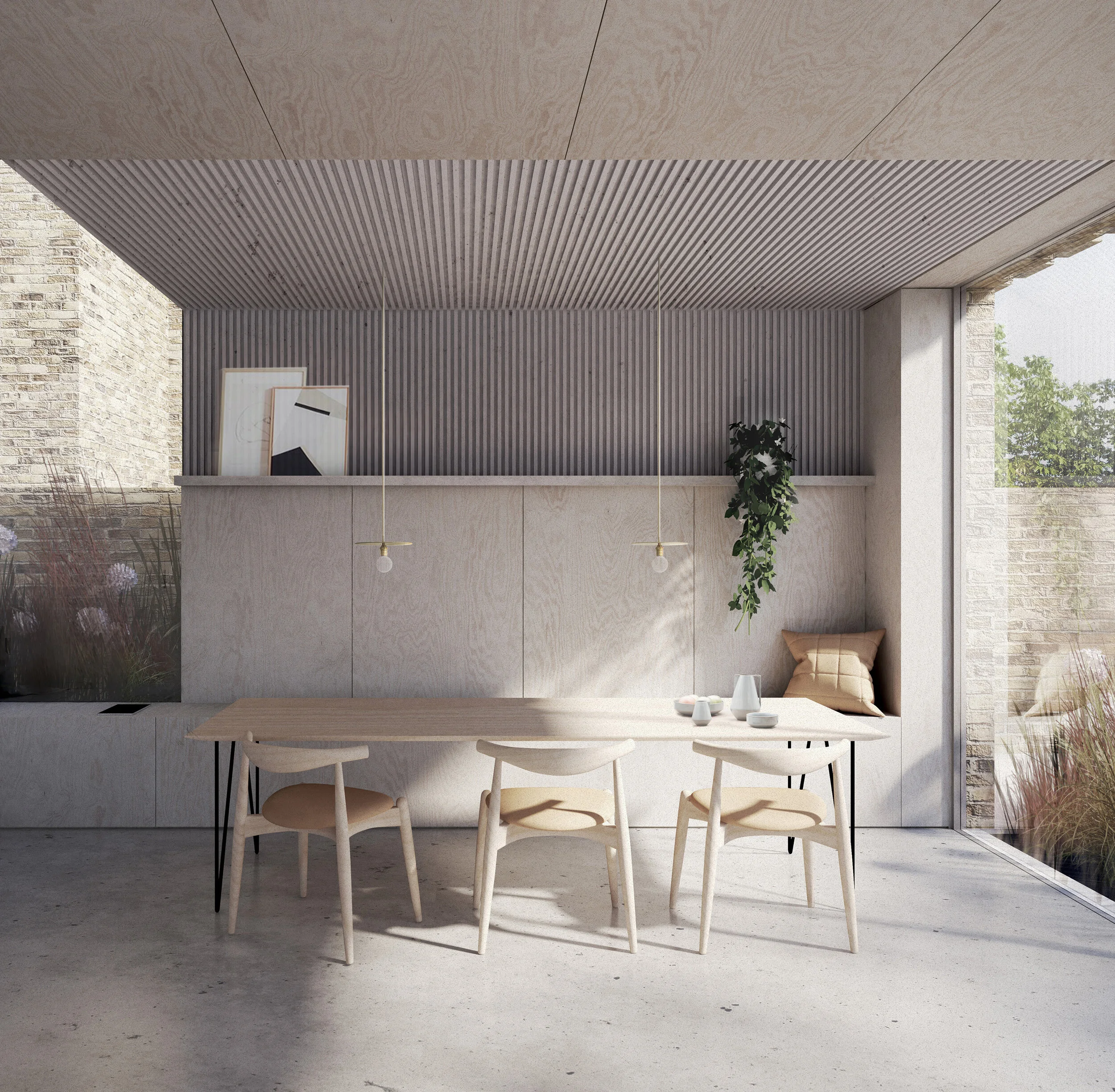 Internally a large open plan kitchen orientates towards a new dining area, with both exposed and concealed storage surrounding. A softly crafted interior pallete balances raw polished concrete, silver anodised glazing, douglas fir panels and fluted cladding.