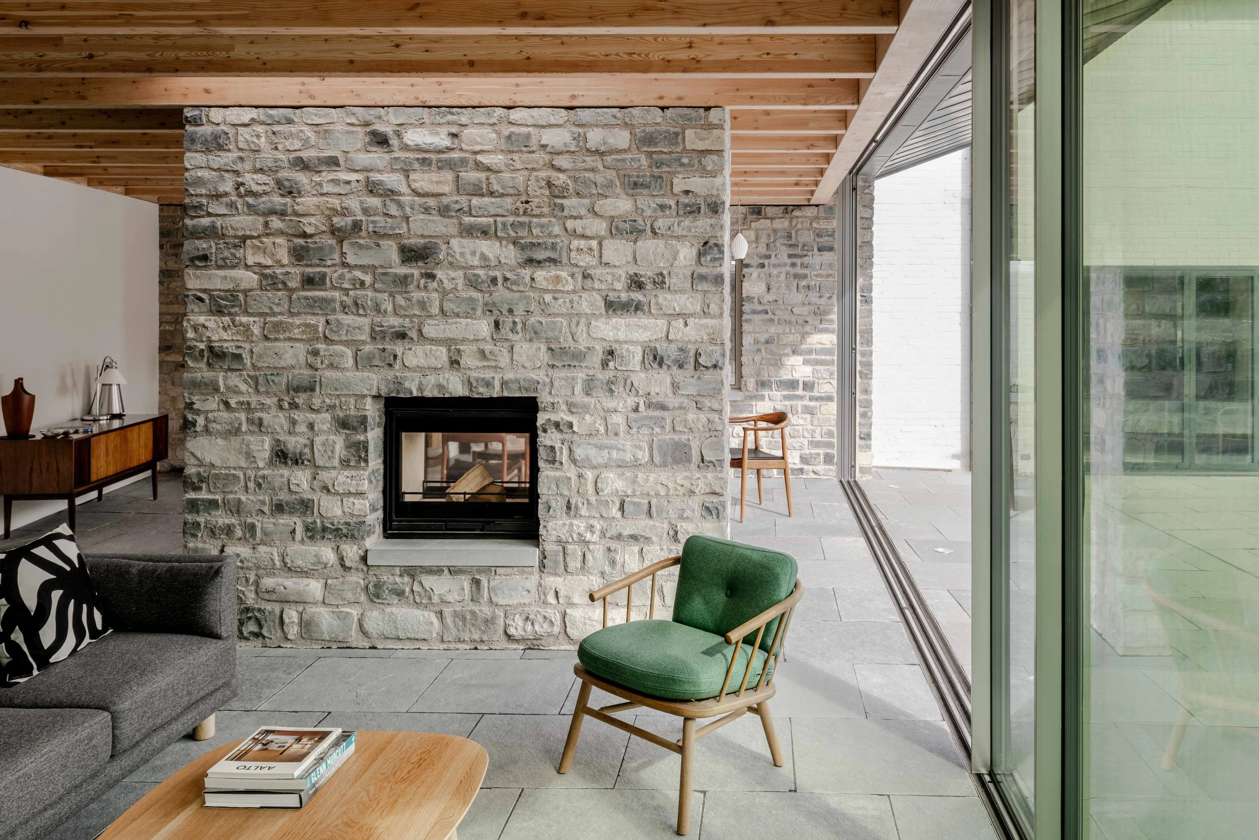 Forgeworks Architects designed the new connecting building, which provides a formal dining and living room, with a minimalist approach - bringing definition and balance between the heavier original structures. The glazing consists of five panels mounted on three recessed tracks, allowing both areas to be fully opened on to the south-facing terrace and swimming pool.
